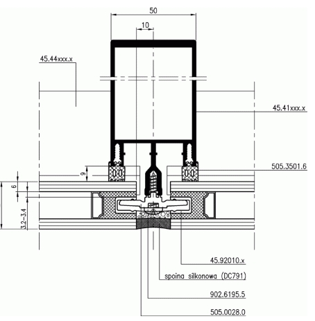 Fasada FA 50 wariant SL – przekrój przez poprzeczkę fasadowy